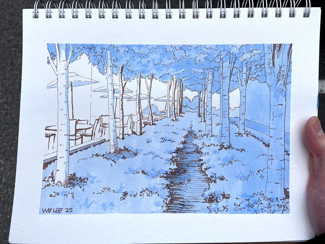 One of my favorite things about Seattle is that there’s so much greenery integrated throughout a very urban city. (We are the Emerald City, after all.) This drawing I did at U Village, an “outdoor mall”. As I wandered the walkways looking for a composition, the architecture-y views around the shopping center weren’t grabbing me. Then I saw this little path through a small stand of trees, with the parasols peeking through the gaps. I went lighter on the ink wash this time to let my line work shine.