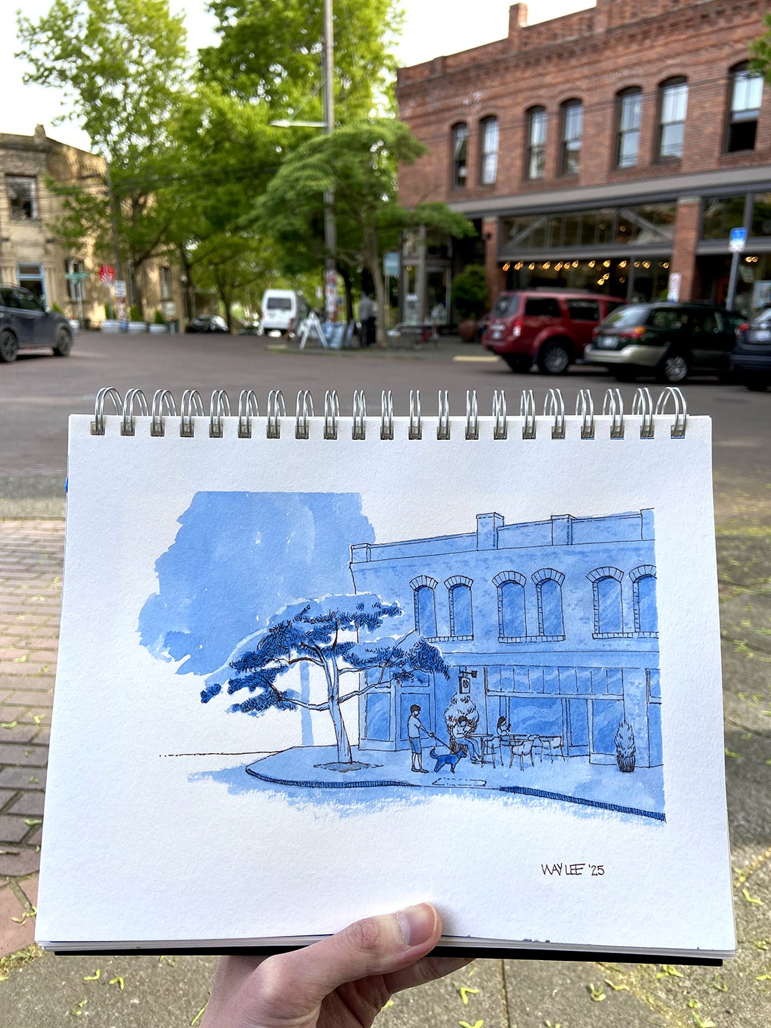Anyway, today I’m sharing another three scenes from around Seattle this spring, continuing with my (brown and) blue ink approach. I’m really enjoying these!