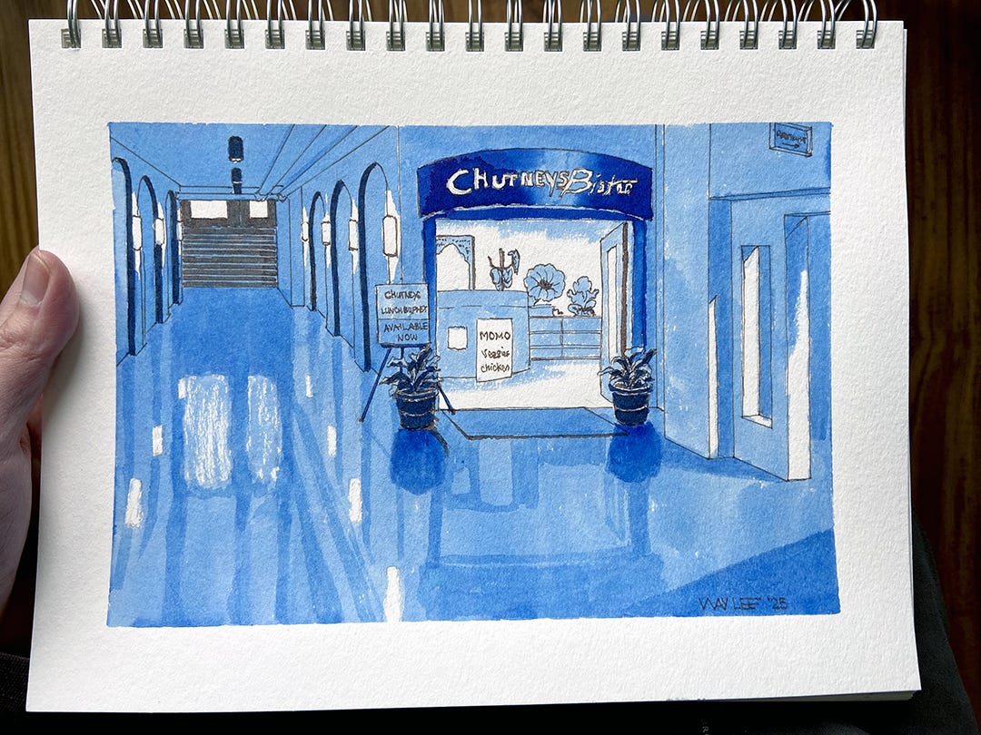 There’s an Indian bistro tucked away under the lonely halls of Wallingford Center in Seattle. The historic building used to house many small shops, but gradually hosts more vacancies in the wake of the pandemic. The lonely atmosphere of the bold banner in the quiet basement caught my attention, along with the waxy floor reflecting the lights.