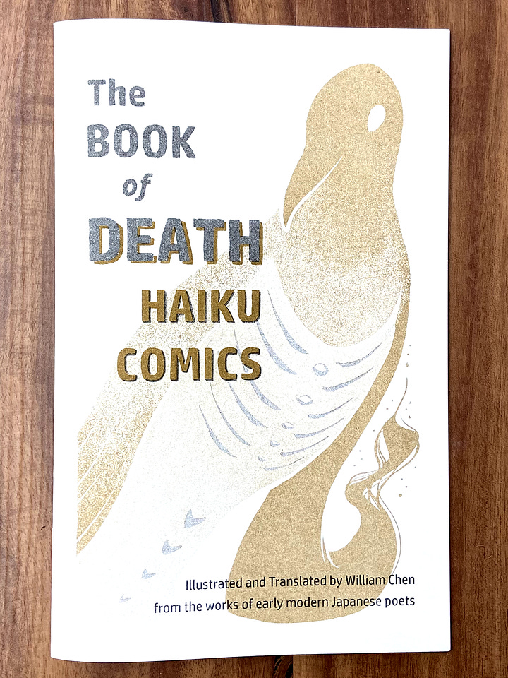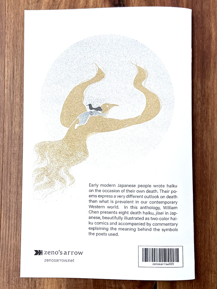 Early modern Japanese people wrote haiku on the occasion of their own death. Their poems express a very different outlook on death than what is prevalent in our contemporary Western world. In this anthology, William Chen presents eight death haiku, jisei in Japanese, beautifully illustrated as two-color haiku comics and accompanied by commentary explaining the meaning behind the symbols the poets used.