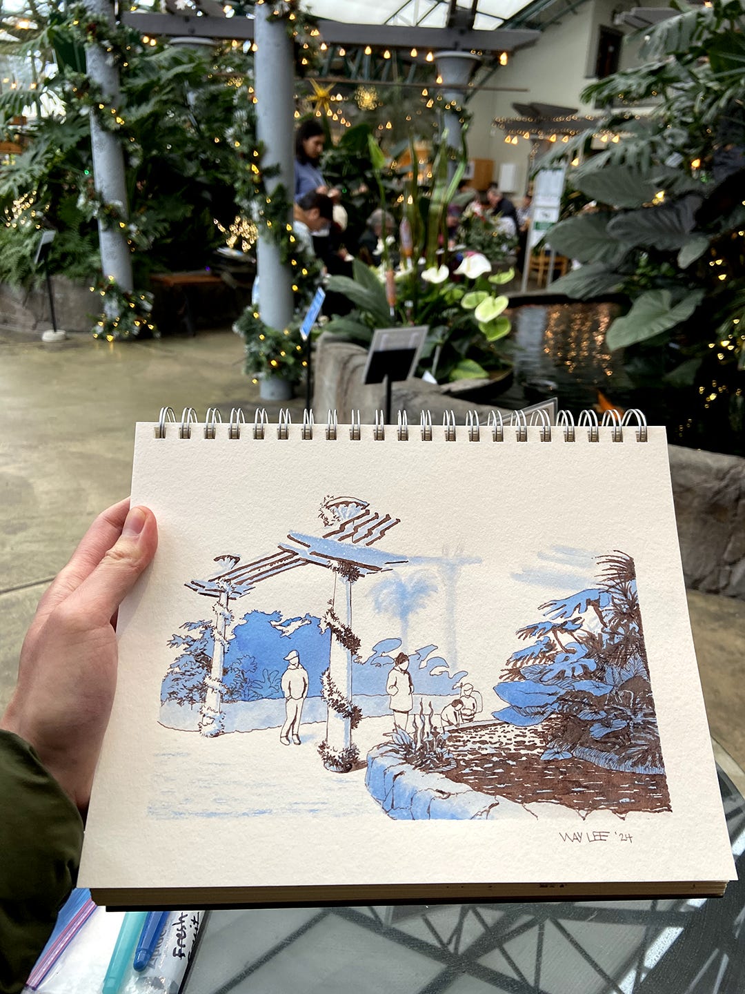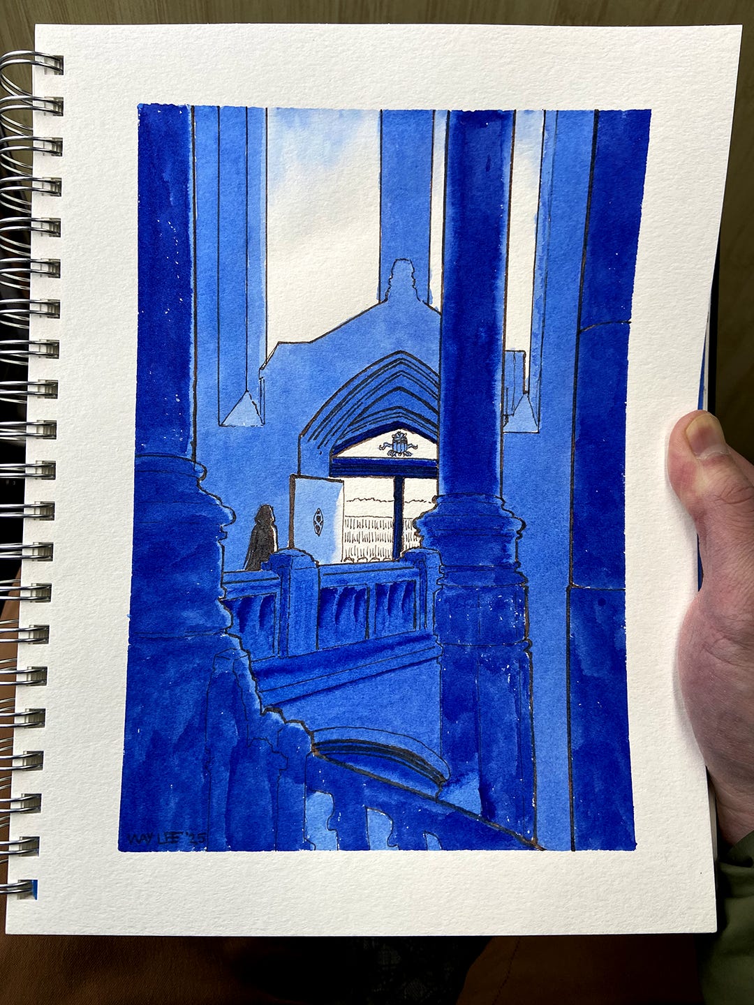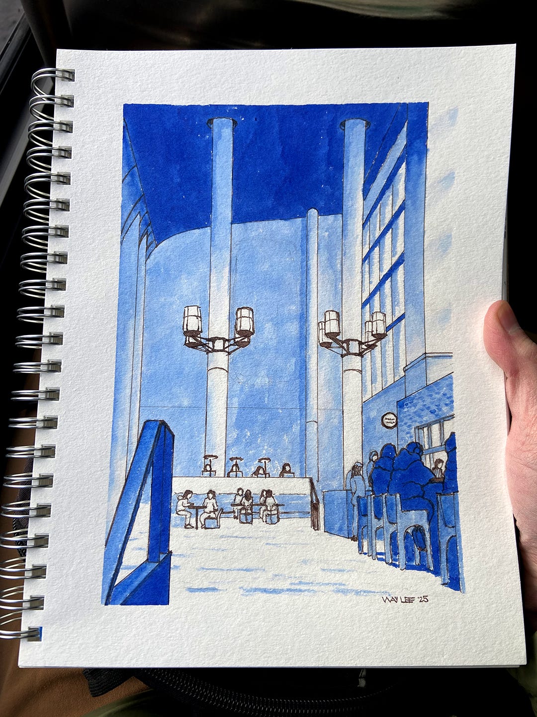 You’ll notice that apparently, I’m in my “Blue Period”. I’m going to stick with the blue this year and try to make it out to an urban sketching event every month so that by the end of the year, I’ll have enough pieces with a generally cohesive look and theme (these sapphire blue environment drawings) to be able to put on a small exhibition in a cafe.