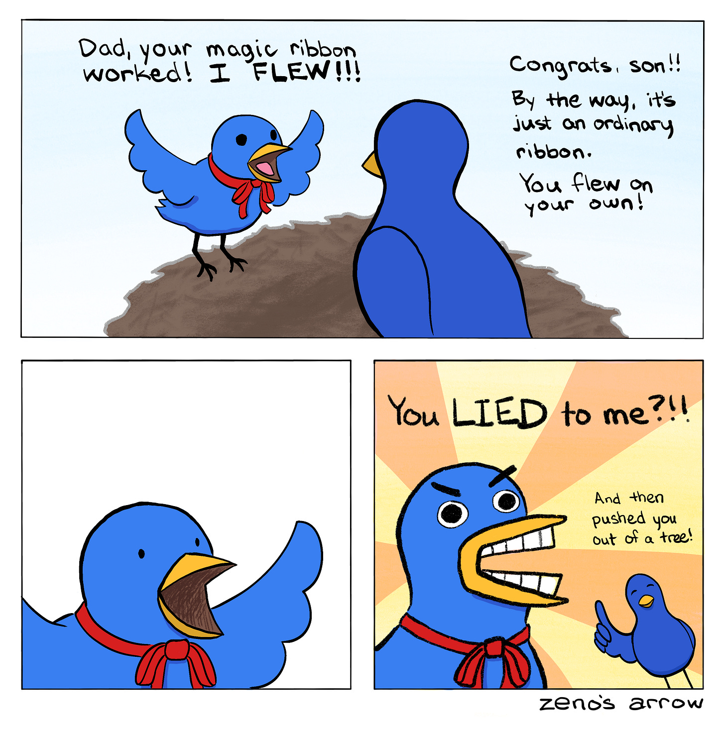 This trope appears in different children’s stories where being given a “magic” object gives a child the confidence to do something they previously couldn’t do. But it always just stuck out to me that the parental figure lies to the kid and sends them out. What if it didn’t work??
