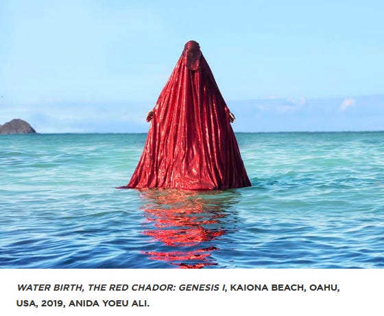 First, I recently visited the Seattle Asian Art Museum, where Anida Yoeu Ali is exhibiting. It’s a great exhibit, I recommend going. In one of the rooms of her exhibit, she talks about her experience putting on a live installation/performance on the National Mall in DC, and how the Smithsonian put a lot of limitations in what she was allowed to do in their contract with her, to tamp down on risks that people might be offended. (This is a simplification, but her eventual installation/performance combined lots of patriotic Americana with her in her red chador, a commentary on who gets to be viewed positively as “American”.)