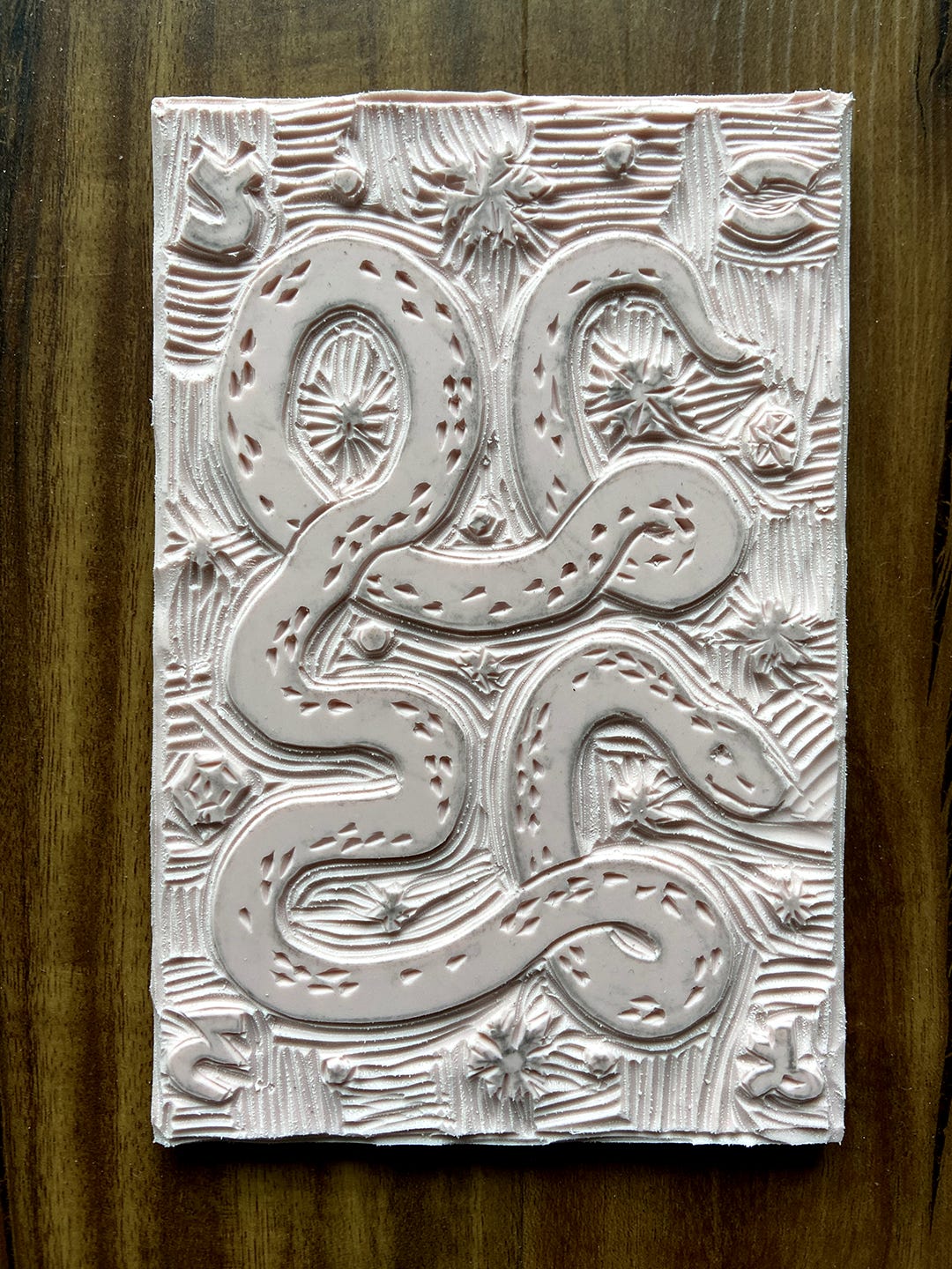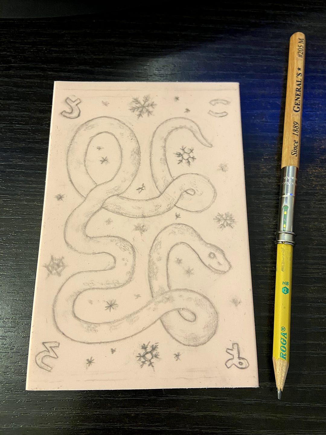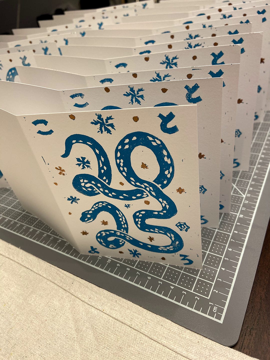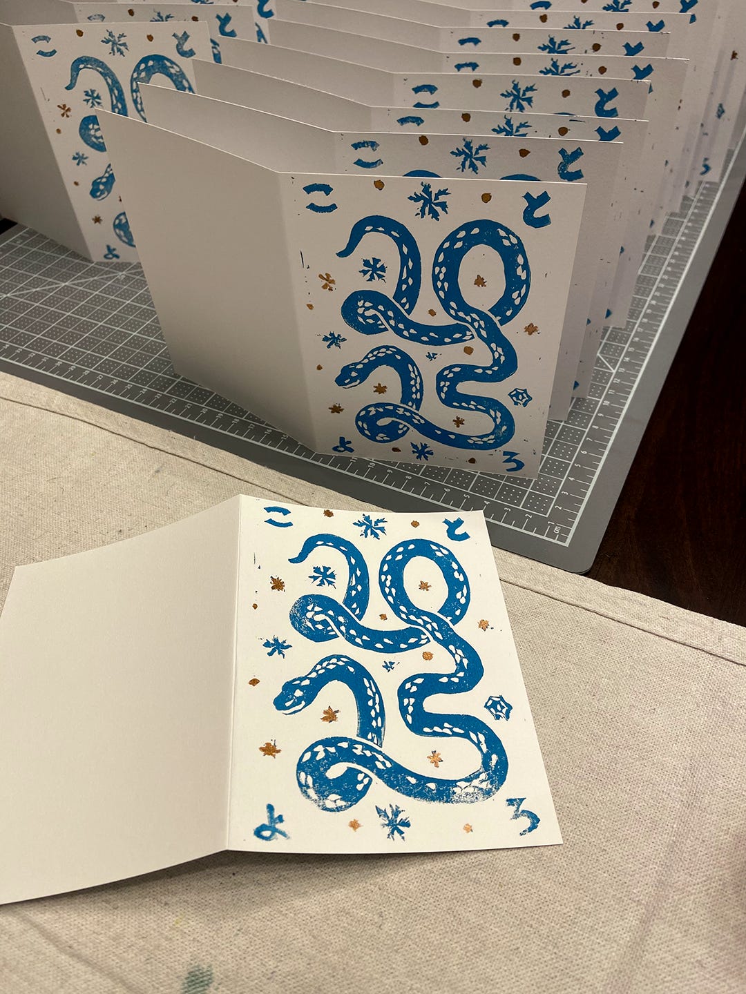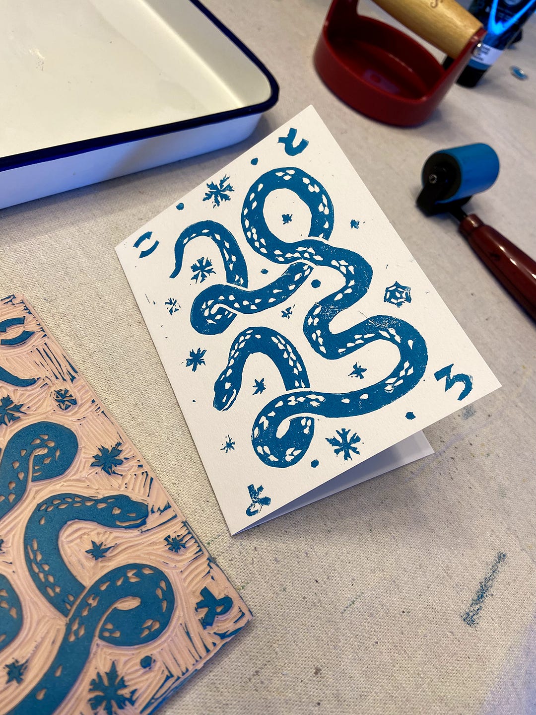 I made this sweet snake design and block-printed cards to send to friends and family.